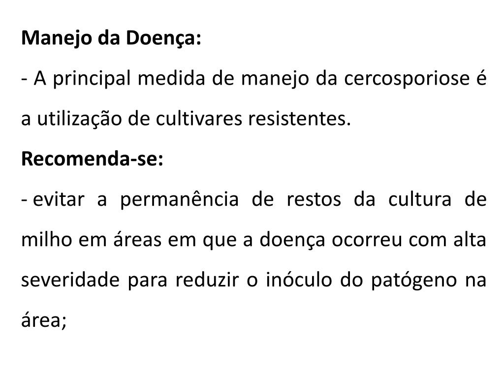 Manejo da Doença: • A principal medida de manejo da cercosporiose é a utilização de cultivares resistentes. • Recomenda-se: • evitar a permanência de restos da cultura de milho em áreas em que a doença ocorreu com alta severidade para reduzir o inóculo do patógeno na área;