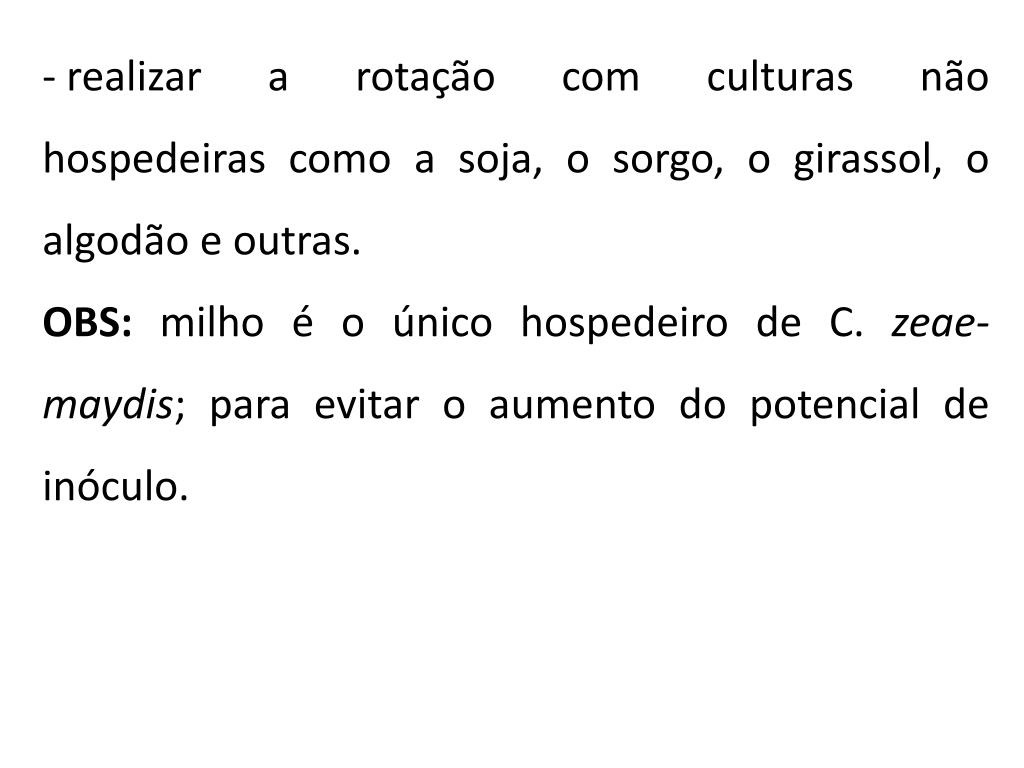 realizar a rotação com culturas nãohospedeiras como a soja, o sorgo, o girassol, o algodão e outras. • OBS: milho é o único hospedeiro de C. zeae-maydis; para evitar o aumento do potencial de inóculo.
