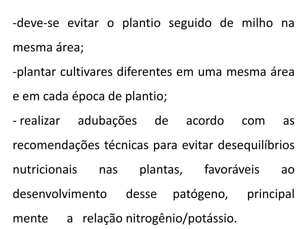 -deve-se evitar o plantio seguido de milho na mesma área; • plantar cultivares diferentes em uma mesma área e em cada época de plantio; • realizar adubações de acordo com as recomendações técnicas para evitar desequilíbrios nutricionais nas plantas, favoráveis ao desenvolvimento desse patógeno, principalmente a relação nitrogênio/potássio.