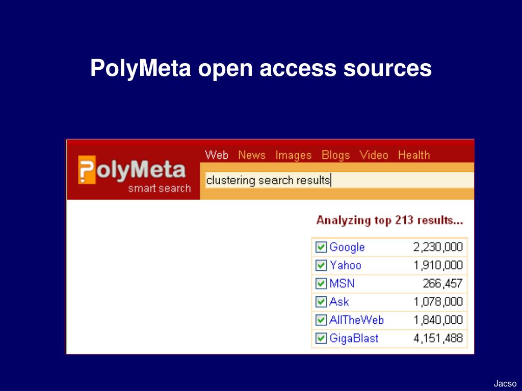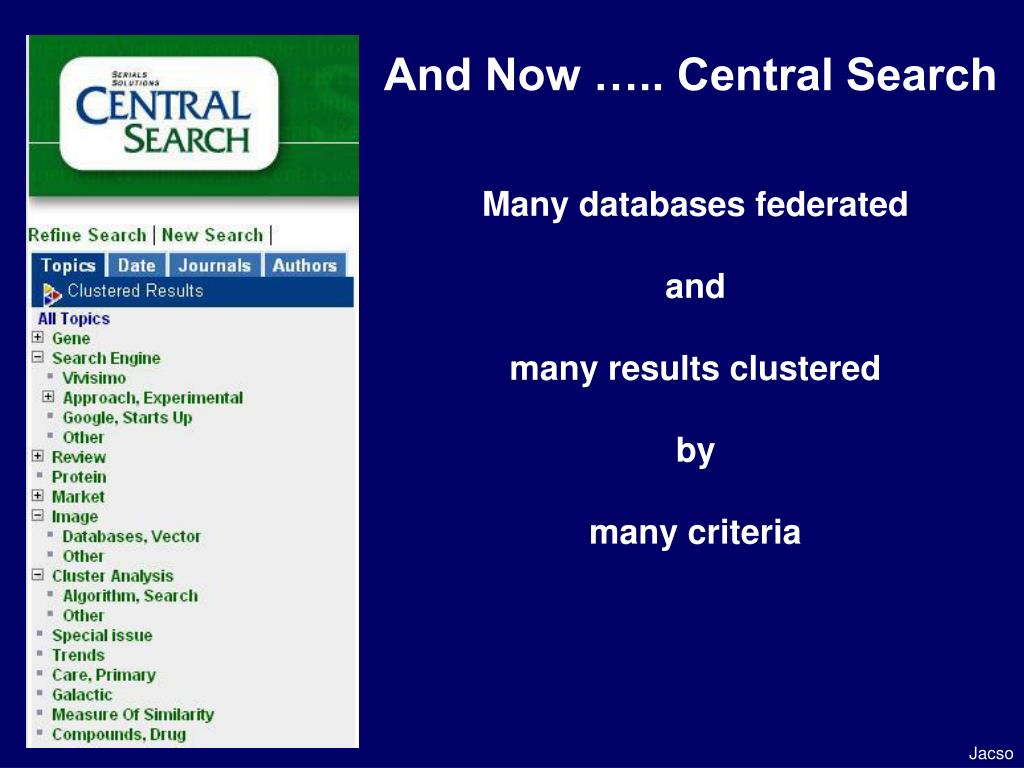 And Now ….. Central SearchMany databases federated andmany results clustered by many criteria Jacso