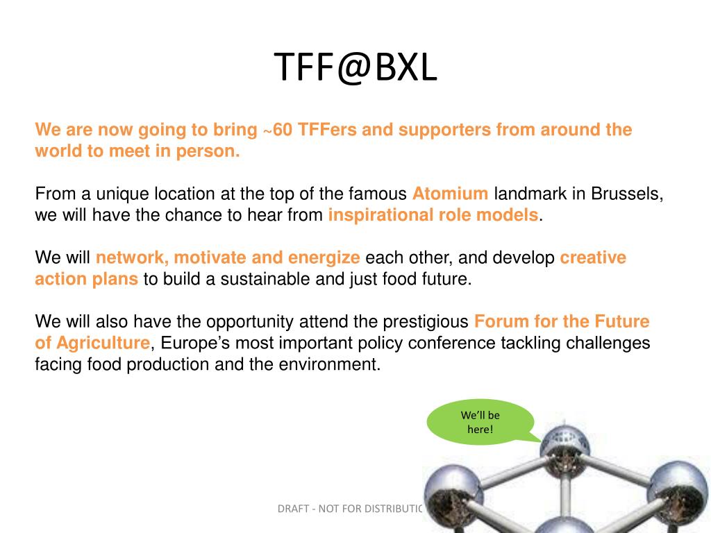 TFF@BXL We are now going to bring ~60 TFFers and supporters from around the world to meet in person. From a unique location at the top of the famous Atomium landmark in Brussels, we will have the chance to hear from inspirational role models. We will network, motivate and energize each other, and develop creative action plans to build a sustainable and just food future. We will also have the opportunity attend the prestigious Forum for the Future of Agriculture, Europe’s most important policy conference tackling challenges facing food production and the environment. We’ll be here! DRAFT - NOT FOR DISTRIBUTION