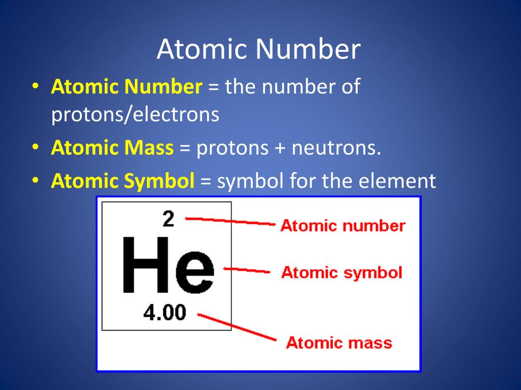 Atomic Number • Atomic Number = the number of protons/electrons • Atomic Mass = protons + neutrons. • Atomic Symbol = symbol for the element