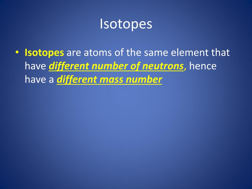 Isotopes • Isotopes are atoms of the same element that have different number of neutrons, hence have a different mass number