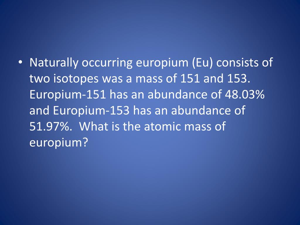 Naturally occurring europium (Eu) consists of two isotopes was a mass of 151 and 153. Europium-151 has an abundance of 48.03% and Europium-153 has an abundance of 51.97%. What is the atomic mass of europium?