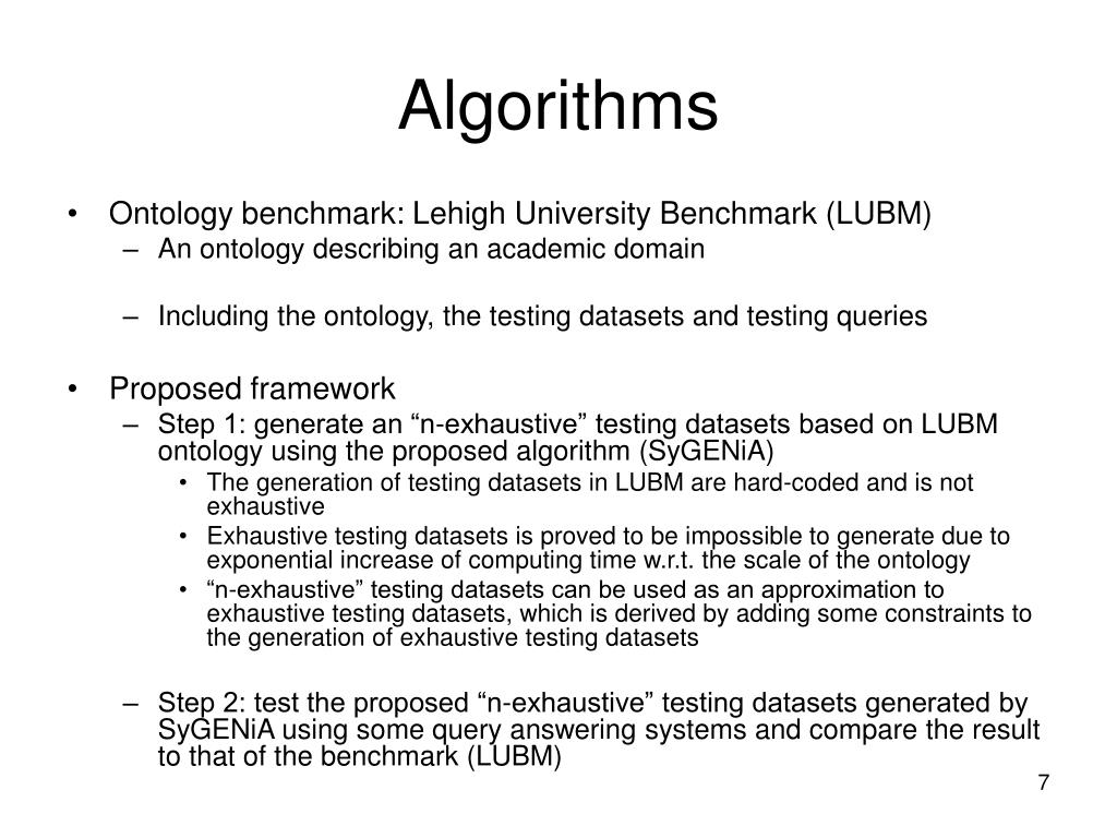 Algorithms • Ontology benchmark: Lehigh University Benchmark (LUBM) • An ontology describing an academic domain • Including the ontology, the testing datasets and testing queries • Proposed framework • Step 1: generate an “n-exhaustive” testing datasets based on LUBM ontology using the proposed algorithm (SyGENiA) • The generation of testing datasets in LUBM are hard-coded and is not exhaustive • Exhaustive testing datasets is proved to be impossible to generate due to exponential increase of computing time w.r.t. the scale of the ontology • “n-exhaustive” testing datasets can be used as an approximation to exhaustive testing datasets, which is derived by adding some constraints to the generation of exhaustive testing datasets • Step 2: test the proposed “n-exhaustive” testing datasets generated by SyGENiA using some query answering systems and compare the result to that of the benchmark (LUBM)