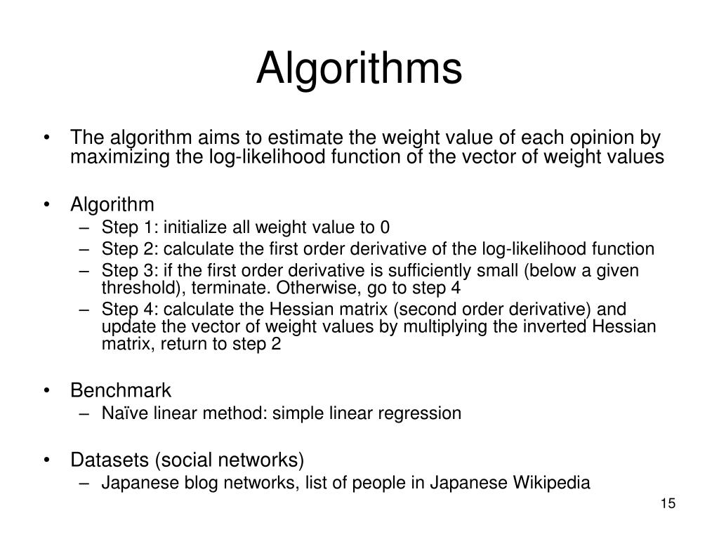Algorithms • The algorithm aims to estimate the weight value of each opinion by maximizing the log-likelihood function of the vector of weight values • Algorithm • Step 1: initialize all weight value to 0 • Step 2: calculate the first order derivative of the log-likelihood function • Step 3: if the first order derivative is sufficiently small (below a given threshold), terminate. Otherwise, go to step 4 • Step 4: calculate the Hessian matrix (second order derivative) and update the vector of weight values by multiplying the inverted Hessian matrix, return to step 2 • Benchmark • Naïve linear method: simple linear regression • Datasets (social networks) • Japanese blog networks, list of people in Japanese Wikipedia