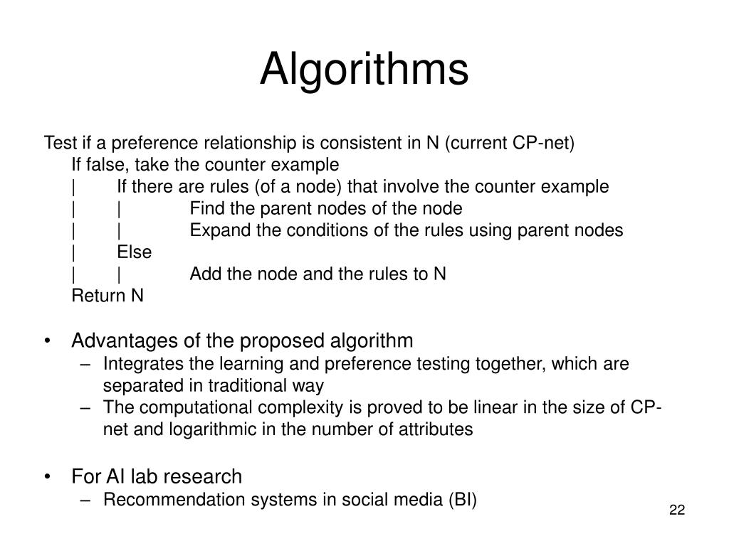 Algorithms Test if a preference relationship is consistent in N (current CP-net) If false, take the counter example | If there are rules (of a node) that involve the counter example | | Find the parent nodes of the node | | Expand the conditions of the rules using parent nodes | Else | | Add the node and the rules to N Return N • Advantages of the proposed algorithm • Integrates the learning and preference testing together, which are separated in traditional way • The computational complexity is proved to be linear in the size of CP-net and logarithmic in the number of attributes • For AI lab research • Recommendation systems in social media (BI)