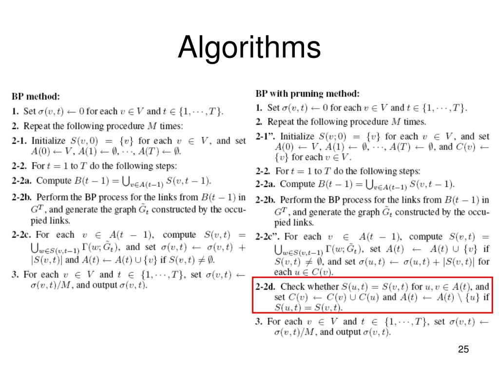 Introduction • Introduction • SIS (Susceptible-Infected-Susceptible) model describes the repeated diffusion of a topic in social network • Influence function • σ(v,t): expected number of nodes infected by v at time t when v was infected at t=0 • Research question • How to estimate the influence function of each node by effective (in terms of computational time) simulation? • Layered graph method • All vertices are presented • Only edges through which topic diffused are added at time t • The graph (edges) evolve with time • Proposed technique and algorithms • Bond percolation (BP) • Bond percolation with pruning method: retain only one node when many nodes have exactly the same influence path at time t