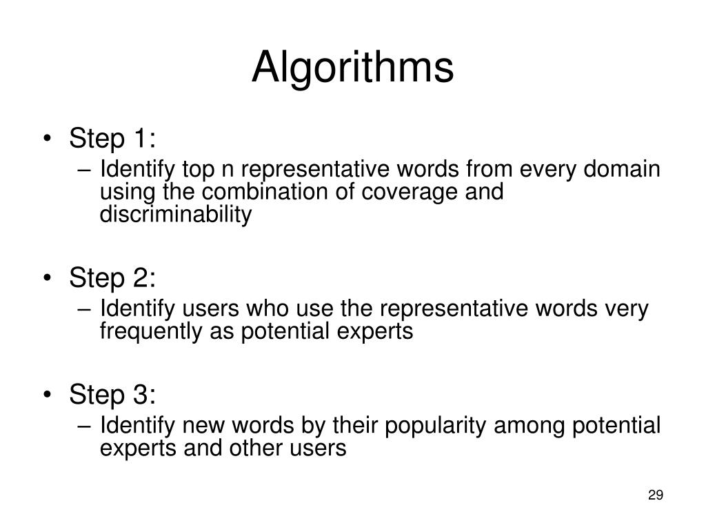 Algorithms • Step 1: • Identify top n representative words from every domain using the combination of coverage and discriminability • Step 2: • Identify users who use the representative words very frequently as potential experts • Step 3: • Identify new words by their popularity among potential experts and other users