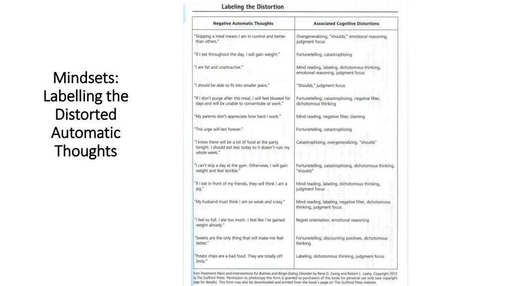 Challenging the Mindsets • “Payoffs” of your distorted thoughts beliefs • Body checking and avoidance / “feeling fat” • “Rules” in maintaining disordered eating