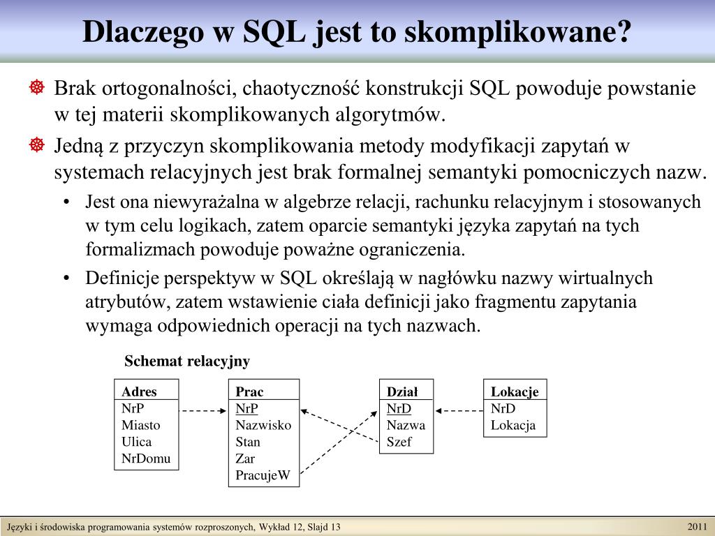 Dlaczego w SQL jest to skomplikowane? • Brak ortogonalności, chaotyczność konstrukcji SQL powoduje powstanie w tej materii skomplikowanych algorytmów. • Jedną z przyczyn skomplikowania metody modyfikacji zapytań w systemach relacyjnych jest brak formalnej semantyki pomocniczych nazw. • Jest ona niewyrażalna w algebrze relacji, rachunku relacyjnym i stosowanych w tym celu logikach, zatem oparcie semantyki języka zapytań na tych formalizmach powoduje poważne ograniczenia. • Definicje perspektyw w SQL określają w nagłówku nazwy wirtualnych atrybutów, zatem wstawienie ciała definicji jako fragmentu zapytania wymaga odpowiednich operacji na tych nazwach. Schemat relacyjny Adres NrP Miasto Ulica NrDomu Prac NrP Nazwisko Stan Zar PracujeW Dział NrD Nazwa Szef Lokacje NrD Lokacja