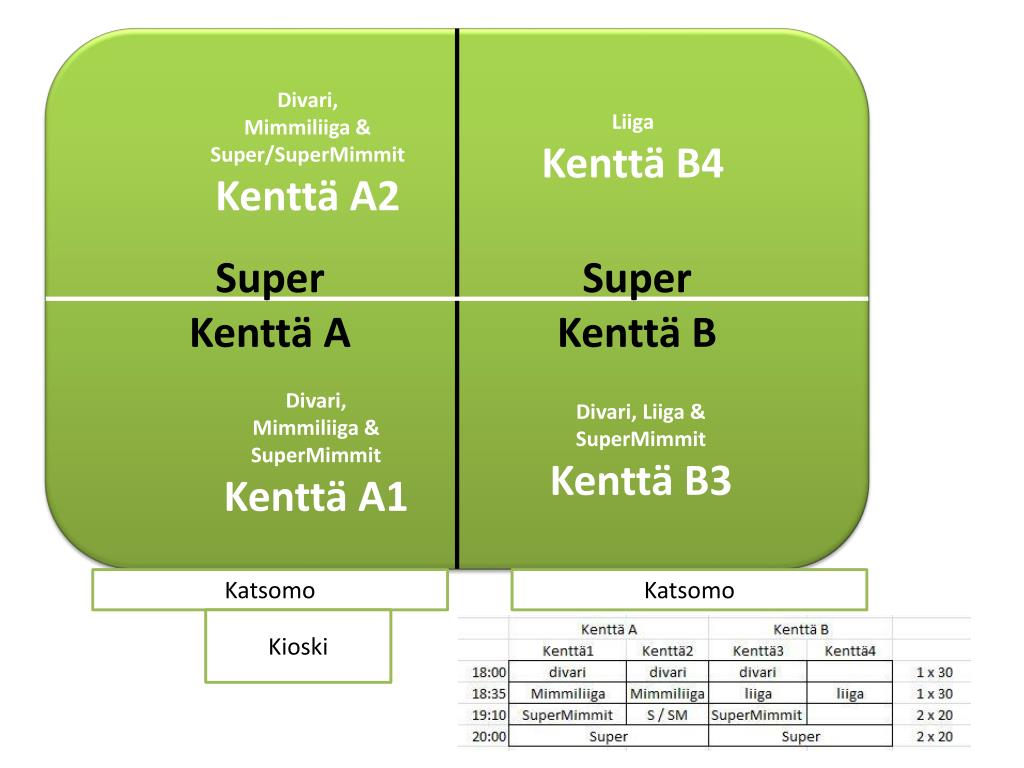 Divari, Mimmiliiga & Super/SuperMimmitKenttä A2 Liiga Kenttä B4 Super Kenttä A Super Kenttä B Divari, Mimmiliiga & SuperMimmit Kenttä A1 Divari, Liiga & SuperMimmit Kenttä B3 Katsomo Katsomo Kioski