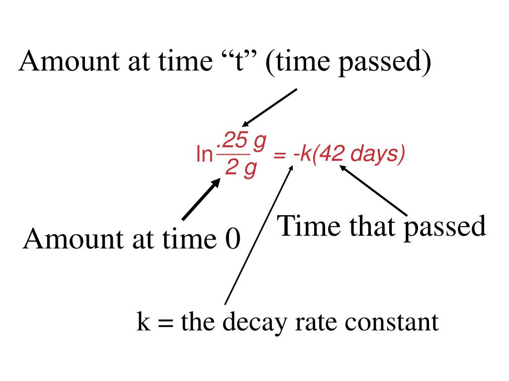 .25 g 2 g = -k(42 days) ln Amount at time “t” (time passed) Time that passed Amount at time 0 k = the decay rate constant