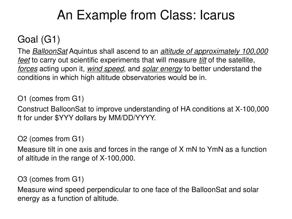 An Example from Class: Icarus Goal (G1) The BalloonSat Aquintus shall ascend to an altitude of approximately 100,000 feet to carry out scientific experiments that will measure tilt of the satellite, forces acting upon it, wind speed, and solar energy to better understand the conditions in which high altitude observatories would be in. Goal (G1) The BalloonSat Aquintus shall ascend to an altitude of approximately 100,000 feet to carry out scientific experiments that will measure tilt of the satellite, forces acting upon it, wind speed, and solar energy to better understand the conditions in which high altitude observatories would be in. Goal (G1) The BalloonSat Aquintus shall ascend to an altitude of approximately 100,000 feet to carry out scientific experiments that will measure tilt of the satellite, forces acting upon it, wind speed, and solar energy to better understand the conditions in which high altitude observatories would be in. O1 (comes from G1) Construct BalloonSat to improve understanding of HA conditions at X-100,000 ft for under $YYY dollars by MM/DD/YYYY. O2 (comes from G1) Measure tilt in one axis and forces in the range of X mN to YmN as a function of altitude in the range of X-100,000. O3 (comes from G1) Measure wind speed perpendicular to one face of the BalloonSat and solar energy as a function of altitude.