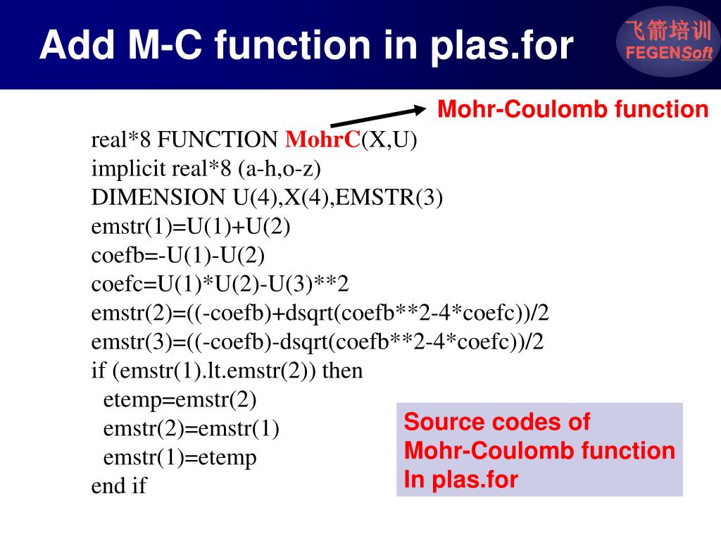 Add M-C function in plas.for if (emstr(1).lt.emstr(3)) then etemp=emstr(3) emstr(3)=emstr(1) emstr(1)=etemp end if if (emstr(2).lt.emstr(3)) then etemp=emstr(2) emstr(2)=emstr(3) emstr(3)=etemp end if tgo=x(1) c=x(2) cosf=1./dsqrt(1.+tgo*tgo) Source codes of Mohr-Coulomb function In plas.for