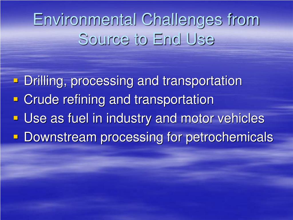 Environmental Challenges from Source to End Use • Drilling, processing and transportation • Crude refining and transportation • Use as fuel in industry and motor vehicles • Downstream processing for petrochemicals