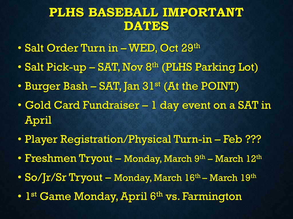 PLHS BASEBALL IMPORTANT DATES • Salt Order Turn in – WED, Oct 29th • Salt Pick-up – SAT, Nov 8th (PLHS Parking Lot) • Burger Bash – SAT, Jan 31st (At the POINT) • Gold Card Fundraiser – 1 day event on a SAT in April • Player Registration/Physical Turn-in – Feb ??? • Freshmen Tryout – Monday, March 9th – March 12th • So/Jr/Sr Tryout – Monday, March 16th – March 19th • 1st Game Monday, April 6th vs. Farmington