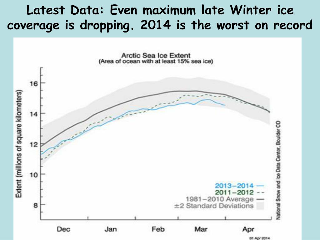Latest Data: Even maximum late Winter ice coverage is dropping. 2014 is the worst on record