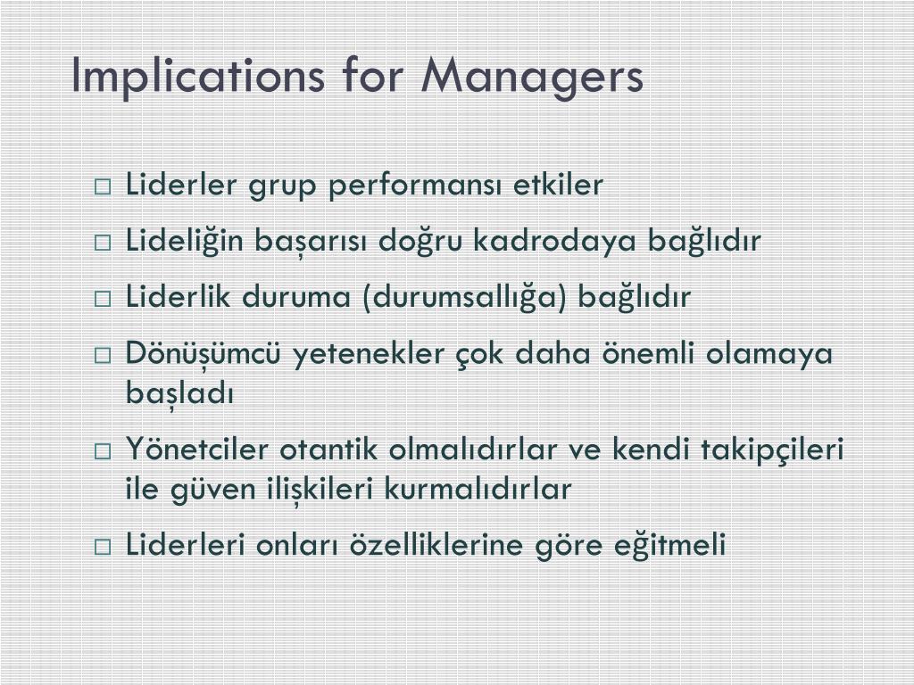 Implications for Managers • Liderler grup performansı etkiler • Lideliğin başarısı doğru kadrodaya bağlıdır • Liderlik duruma (durumsallığa) bağlıdır • Dönüşümcü yetenekler çok daha önemli olamaya başladı • Yönetciler otantik olmalıdırlar ve kendi takipçileri ile güven ilişkileri kurmalıdırlar • Liderleri onları özelliklerine göre eğitmeli