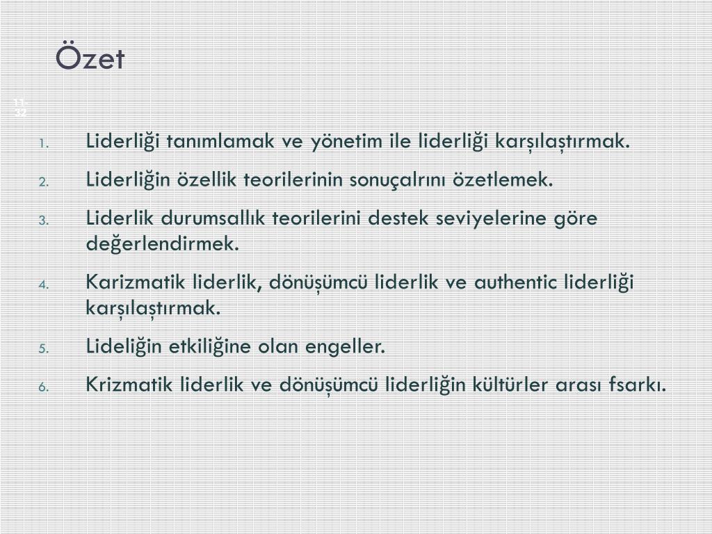 Özet • Liderliği tanımlamak ve yönetim ile liderliği karşılaştırmak. • Liderliğin özellik teorilerinin sonuçalrını özetlemek. • Liderlik durumsallık teorilerini destek seviyelerine göre değerlendirmek. • Karizmatik liderlik, dönüşümcü liderlik ve authentic liderliği karşılaştırmak. • Lideliğin etkiliğine olan engeller. • Krizmatik liderlik ve dönüşümcü liderliğin kültürler arası fsarkı.