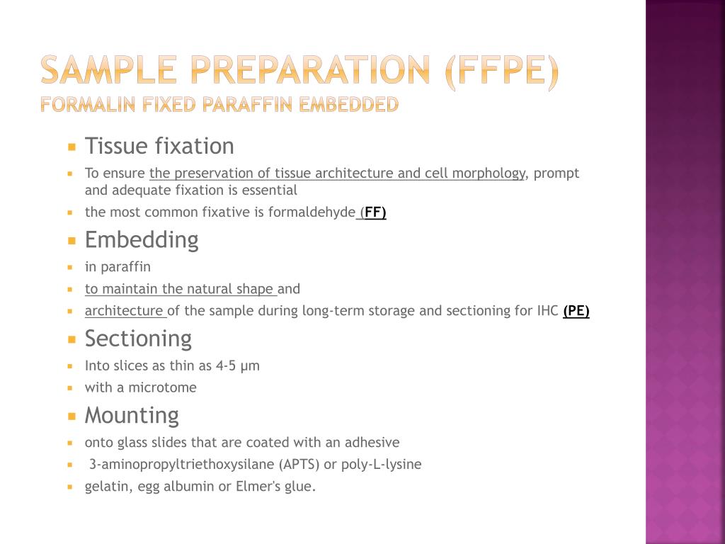 Sample preparation (FFPE) formalin fixed paraffin embedded • Tissue fixation • To ensure the preservation of tissue architecture and cell morphology, prompt and adequate fixation is essential • the most common fixative is formaldehyde (FF) • Embedding • in paraffin • to maintain the natural shape and • architecture of the sample during long-term storage and sectioning for IHC (PE) • Sectioning • Into slices as thin as 4-5 μm • with a microtome • Mounting • onto glass slides that are coated with an adhesive • 3-aminopropyltriethoxysilane (APTS) or poly-L-lysine • gelatin, egg albumin or Elmer's glue.