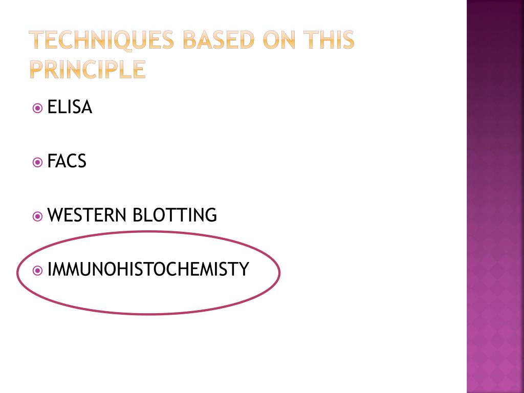 Techniques based on this principle • ELISA • FACS • WESTERN BLOTTING • IMMUNOHISTOCHEMISTY