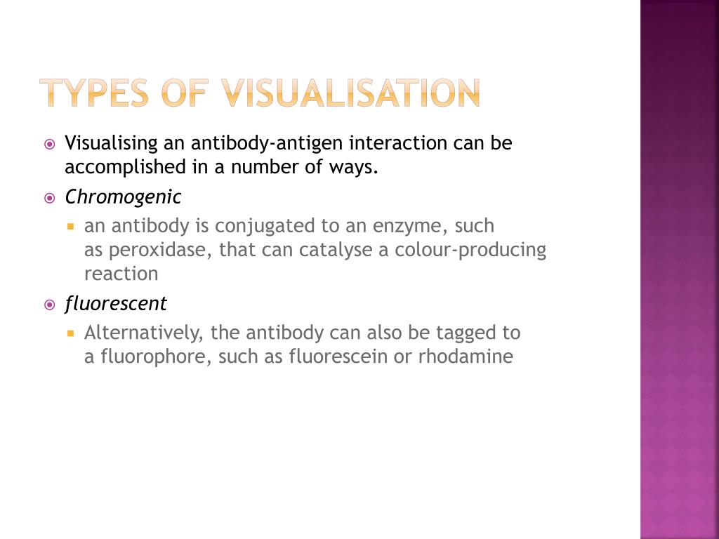 TYPES OF VISUALISATION • Visualising an antibody-antigen interaction can be accomplished in a number of ways. • Chromogenic • an antibody is conjugated to an enzyme, such as peroxidase, that can catalyse a colour-producing reaction • fluorescent • Alternatively, the antibody can also be tagged to a fluorophore, such as fluorescein or rhodamine