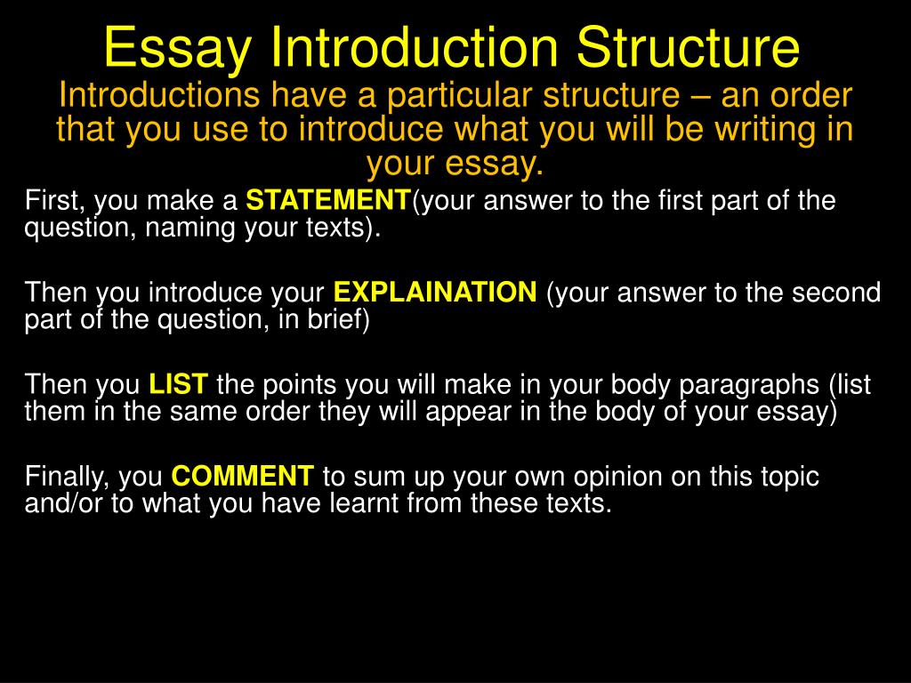 Essay Introduction Structure Introductions have a particular structure – an order that you use to introduce what you will be writing in your essay. First, you make a STATEMENT(your answer to the first part of the question, naming your texts). Then you introduce your EXPLAINATION (your answer to the second part of the question, in brief) Then you LIST the points you will make in your body paragraphs (list them in the same order they will appear in the body of your essay) Finally, you COMMENT to sum up your own opinion on this topic and/or to what you have learnt from these texts.