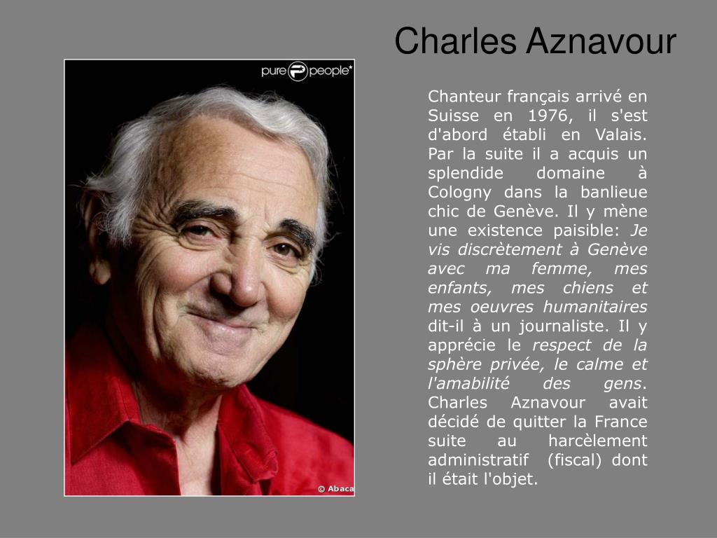 Charles Aznavour Chanteur français arrivé en Suisse en 1976, il s'est d'abord établi en Valais. Par la suite il a acquis un splendide domaine à Cologny dans la banlieue chic de Genève. Il y mène une existence paisible: Je vis discrètement à Genève avec ma femme, mes enfants, mes chiens et mes oeuvres humanitaires dit-il à un journaliste. Il y apprécie le respect de la sphère privée, le calme et l'amabilité des gens. Charles Aznavour avait décidé de quitter la France suite au harcèlement administratif (fiscal) dont il était l'objet.