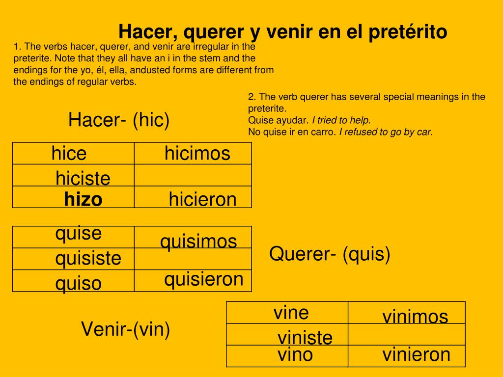 Hacer, querer y venir en el pretérito 1. The verbs hacer, querer, and venir are irregular in the preterite. Note that they all have an i in the stem and the endings for the yo, él, ella, andusted forms are different from the endings of regular verbs. 2. The verb querer has several special meanings in the preterite. Quiseayudar. I tried to help. No quiseir en carro. I refused to go by car. Hacer- (hic) Querer- (quis) Venir-(vin)