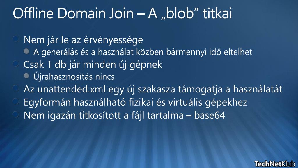 Offline Domain Join– A „blob” titkai • Nem jár le az érvényessége • A generálás és a használat közben bármennyi idő eltelhet • Csak 1 db jár minden új gépnek • Újrahasznosítás nincs • Az unattended.xml egy új szakasza támogatja a használatát • Egyformán használható fizikai és virtuális gépekhez • Nem igazán titkosított a fájl tartalma – base64