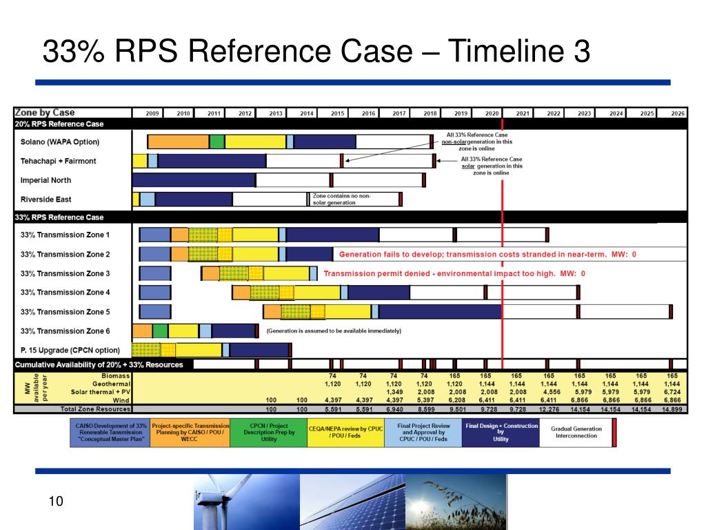 33% RPS Implementation Analysis • Timelines created for the 33% Reference Case – not for any of other 3 cases • Timeline 1: Historical experience, reforms/risk • Timeline 2: Reforms, no risks • Timeline 3: Reforms + external risks • Goal: Better understand the tradeoffs between cost, risk, and time associated with particular procurement strategies • Identify market and regulatory barriers to renewable development • Identify solutions and their impacts on achievement of a 33% RPS