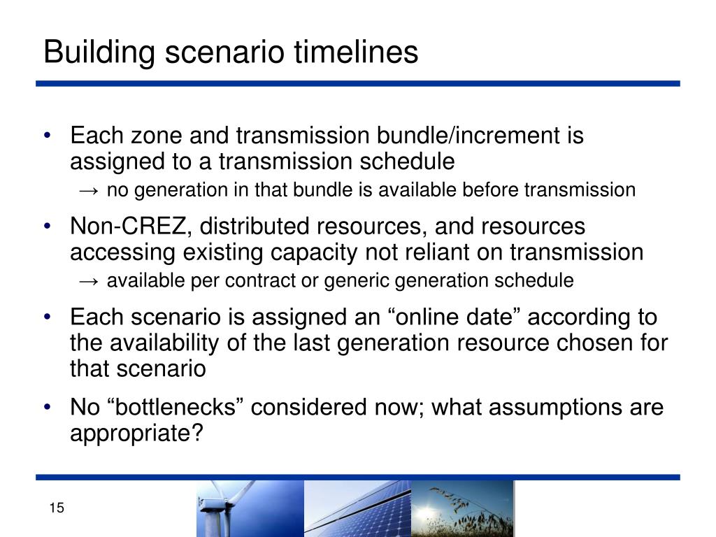 Building scenario timelines • Each zone and transmission bundle/increment is assigned to a transmission schedule • no generation in that bundle is available before transmission • Non-CREZ, distributed resources, and resources accessing existing capacity not reliant on transmission • available per contract or generic generation schedule • Each scenario is assigned an “online date” according to the availability of the last generation resource chosen for that scenario • No “bottlenecks” considered now; what assumptions are appropriate?
