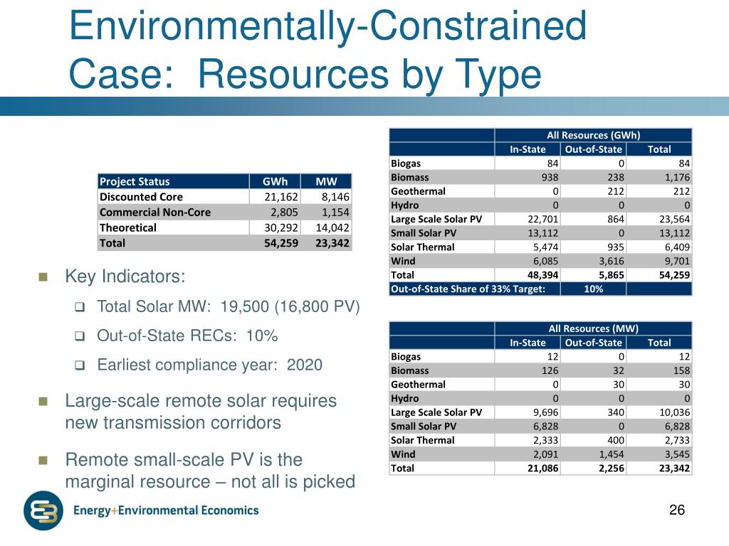 Environmentally-Constrained Case: Resources by Type • Key Indicators: • Total Solar MW: 19,500 (16,800 PV) • Out-of-State RECs: 10% • Earliest compliance year: 2020 • Large-scale remote solar requires new transmission corridors • Remote small-scale PV is the marginal resource – not all is picked