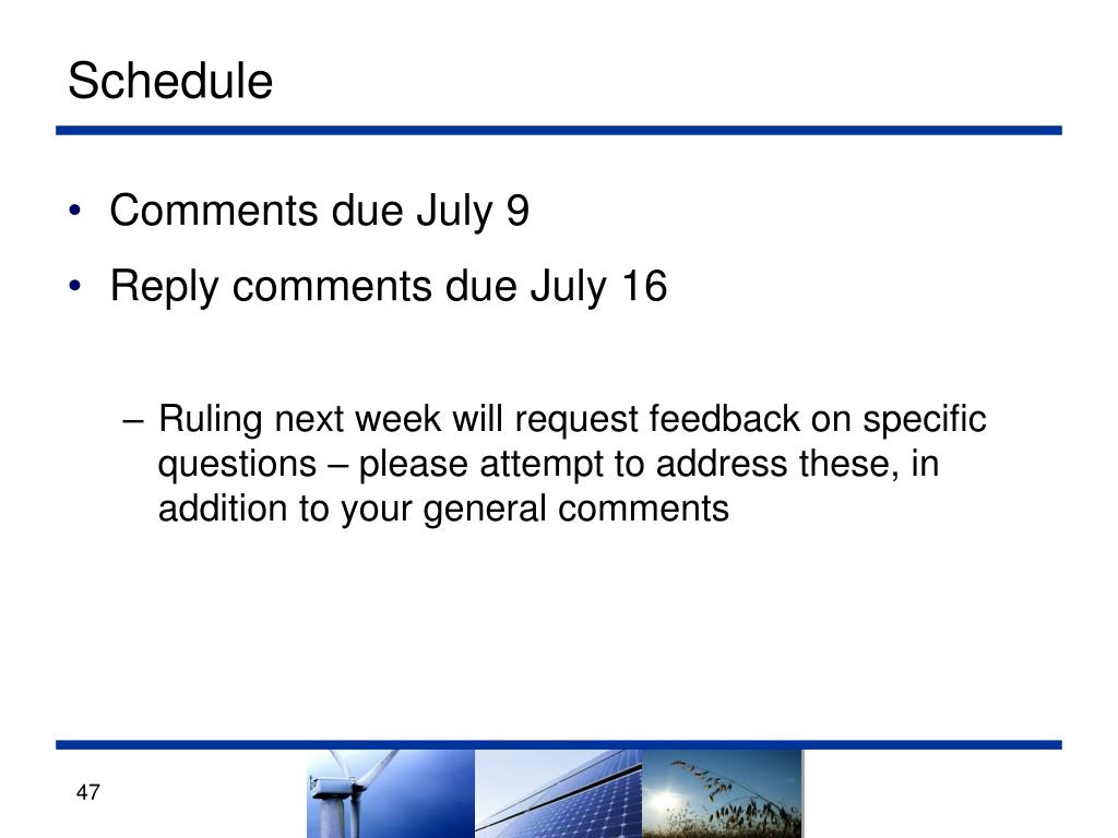Schedule • Comments due July 9 • Reply comments due July 16 • Ruling next week will request feedback on specific questions – please attempt to address these, in addition to your general comments