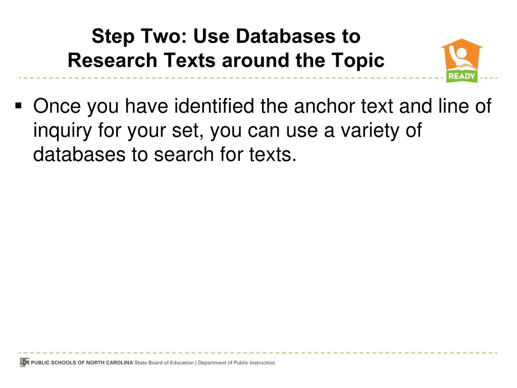 Step Two: Use Databases to Research Texts around the Topic • Once you have identified the anchor text and line of inquiry for your set, you can use a variety of databases to search for texts.