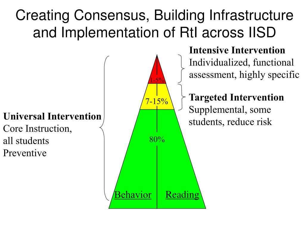 Creating Consensus, Building Infrastructure and Implementation of RtI across IISD Intensive Intervention Individualized, functional assessment, highly specific Targeted Intervention Supplemental, some students, reduce risk Universal Intervention Core Instruction, all students Preventive Reading 1-5% 7-15% 80% Behavior