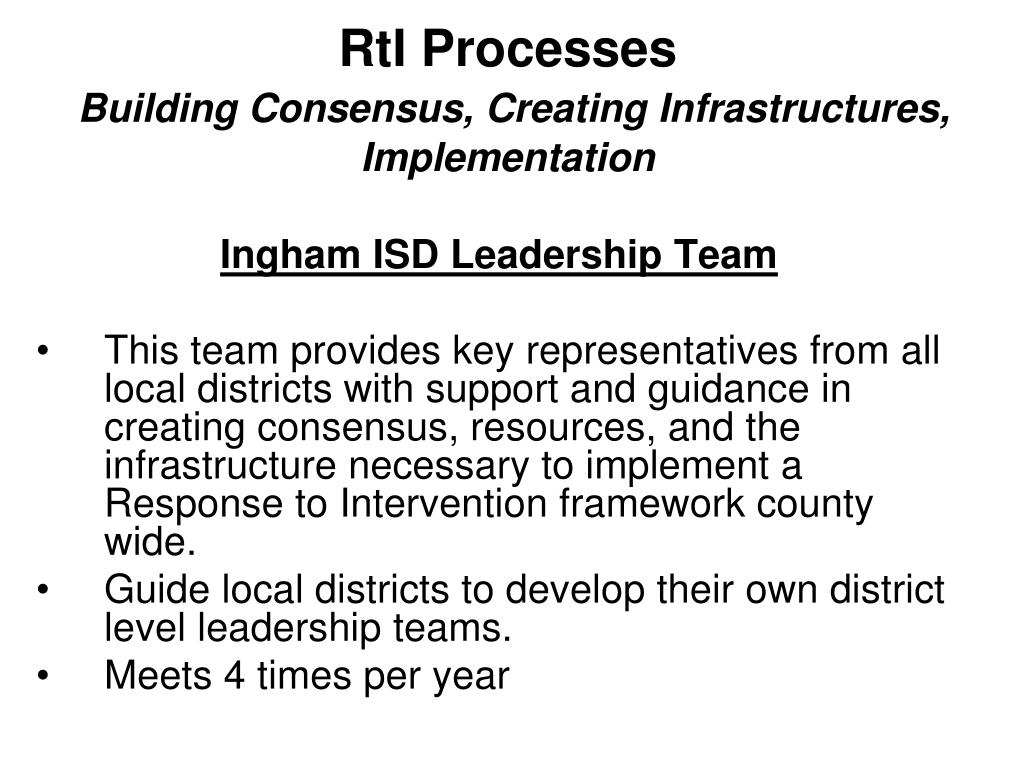 RtI ProcessesBuilding Consensus, Creating Infrastructures, Implementation Ingham ISD Leadership Team This team provides key representatives from all local districts with support and guidance in creating consensus, resources, and the infrastructure necessary to implement a Response to Intervention framework county wide. Guide local districts to develop their own district level leadership teams. Meets 4 times per year