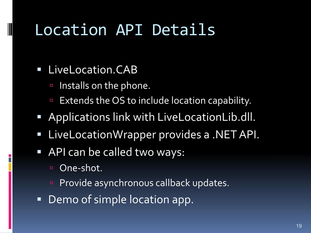 Location API Details • LiveLocation.CAB • Installs on the phone. • Extends the OS to include location capability. • Applications link with LiveLocationLib.dll. • LiveLocationWrapper provides a .NET API. • API can be called two ways: • One-shot. • Provide asynchronous callback updates. • Demo of simple location app.