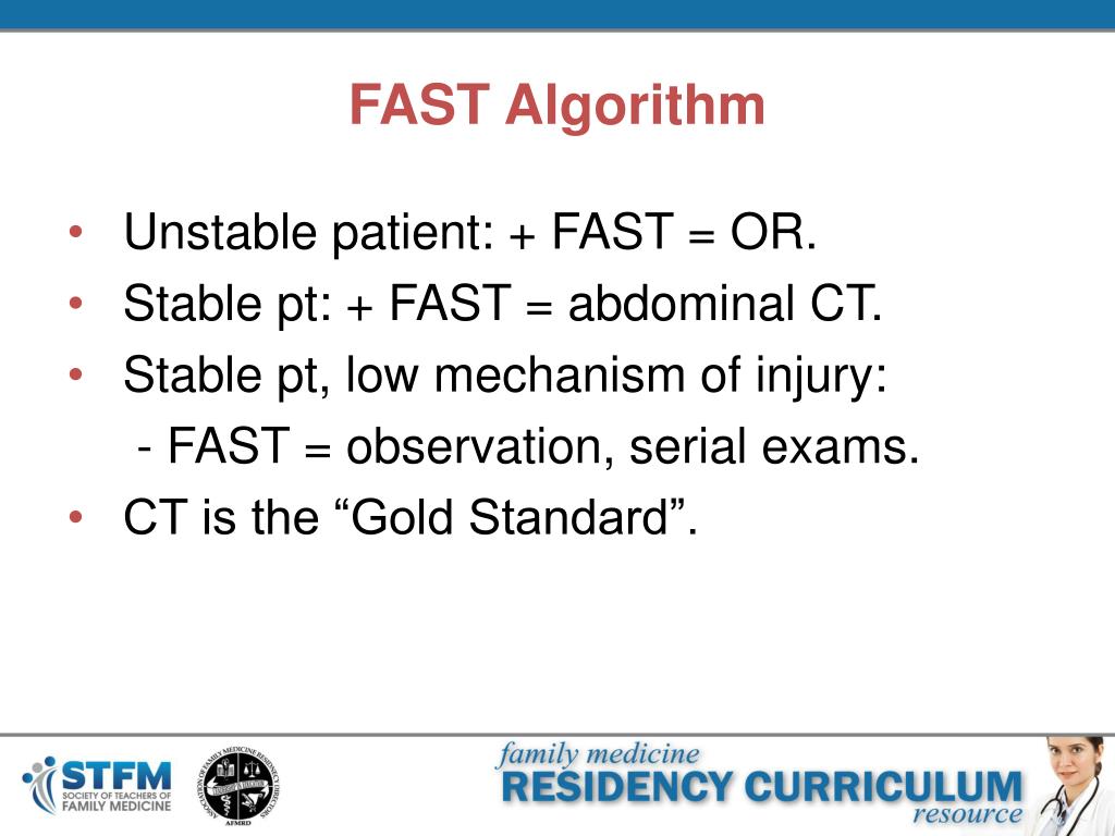 FAST Algorithm • Unstable patient: + FAST = OR. • Stable pt: + FAST = abdominal CT. • Stable pt, low mechanism of injury: - FAST = observation, serial exams. • CT is the “Gold Standard”.