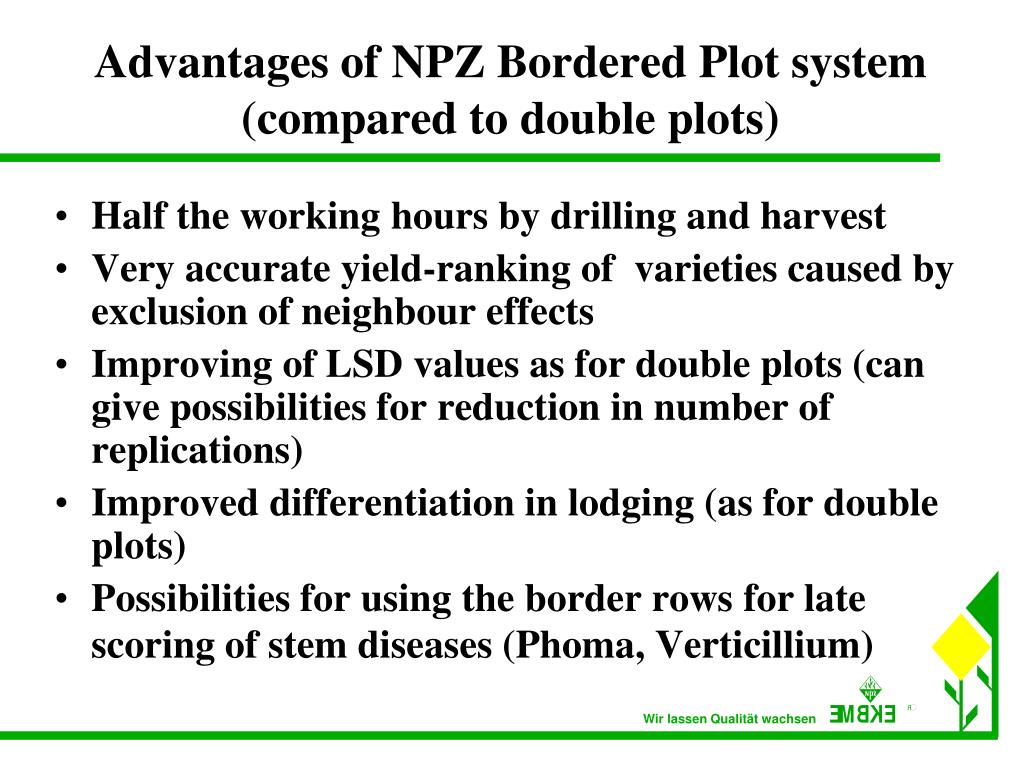 Advantages of NPZ Bordered Plot system (compared to double plots) • Half the working hours by drilling and harvest • Very accurate yield-ranking of varieties caused by exclusion of neighbour effects • Improving of LSD values as for double plots (can give possibilities for reduction in number of replications) • Improved differentiation in lodging (as for double plots) • Possibilities for using the border rows for late scoring of stem diseases (Phoma, Verticillium) Wir lassen Qualität wachsen