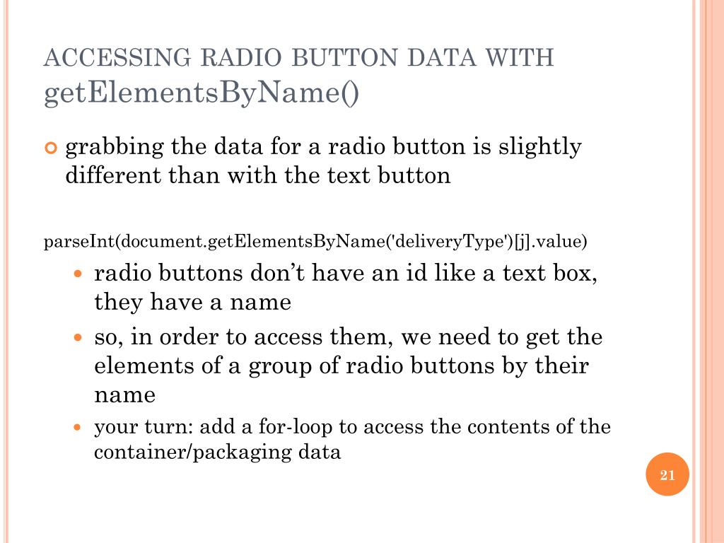 accessing radio button data with getElementsByName() • grabbing the data for a radio button is slightly different than with the text button parseInt(document.getElementsByName('deliveryType')[j].value) • radio buttons don’t have an id like a text box, they have a name • so, in order to access them, we need to get the elements of a group of radio buttons by their name • your turn: add a for-loop to access the contents of the container/packaging data