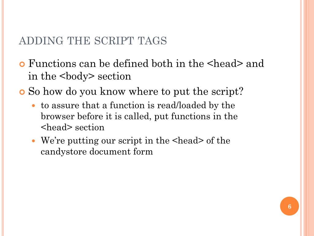 adding the script tags • Functions can be defined both in the <head> and in the <body> section • So how do you know where to put the script? • to assure that a function is read/loaded by the browser before it is called, put functions in the <head> section • We’re putting our script in the <head> of the candystore document form