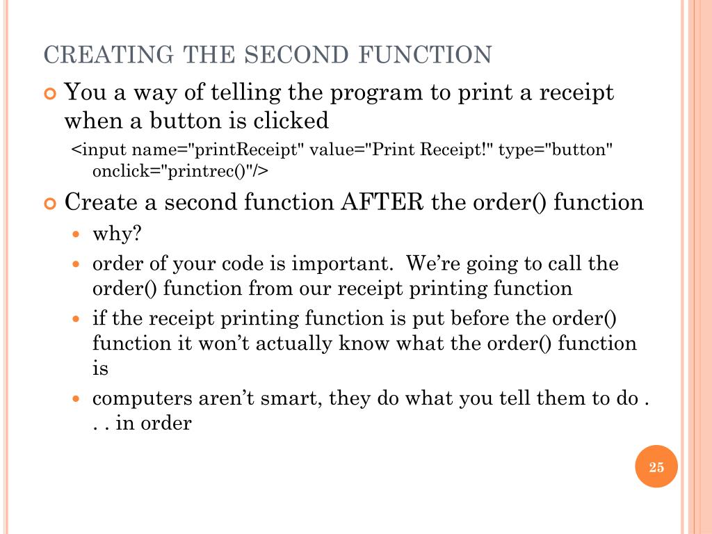 creating the second function • You a way of telling the program to print a receipt when a button is clicked <input name="printReceipt" value="Print Receipt!" type="button" onclick="printrec()"/> • Create a second function AFTER the order() function • why? • order of your code is important. We’re going to call the order() function from our receipt printing function • if the receipt printing function is put before the order() function it won’t actually know what the order() function is • computers aren’t smart, they do what you tell them to do . . . in order