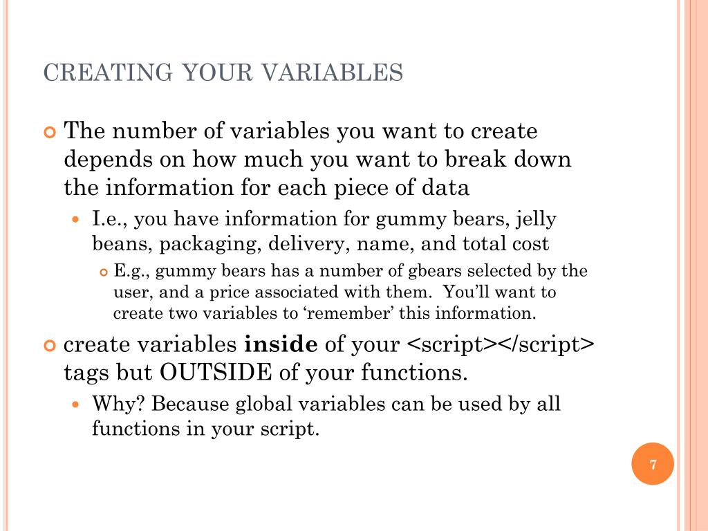 creating your variables • The number of variables you want to create depends on how much you want to break down the information for each piece of data • I.e., you have information for gummy bears, jelly beans, packaging, delivery, name, and total cost • E.g., gummy bears has a number of gbears selected by the user, and a price associated with them. You’ll want to create two variables to ‘remember’ this information. • create variables inside of your <script></script> tags but OUTSIDE of your functions. • Why? Because global variables can be used by all functions in your script.