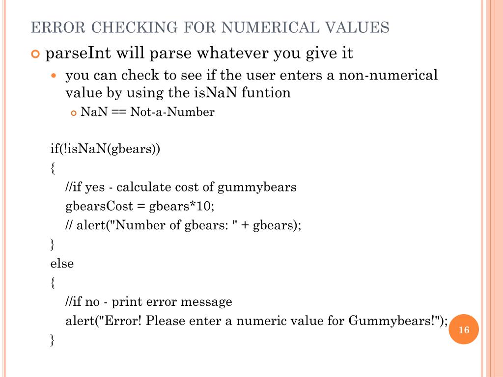 error checking for numerical values • parseInt will parse whatever you give it • you can check to see if the user enters a non-numerical value by using the isNaNfuntion • NaN == Not-a-Number if(!isNaN(gbears)) { //if yes - calculate cost of gummybears gbearsCost = gbears*10; // alert("Number of gbears: " + gbears); } else { //if no - print error message alert("Error! Please enter a numeric value for Gummybears!"); }
