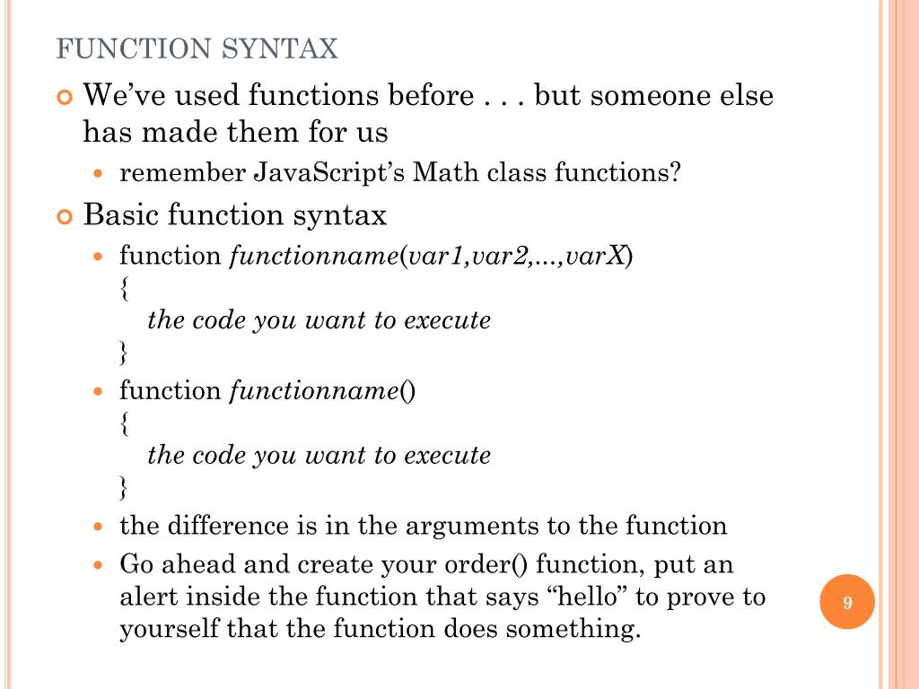 function syntax • We’ve used functions before . . . but someone else has made them for us • remember JavaScript’s Math class functions? • Basic function syntax • function functionname(var1,var2,...,varX){the code you want to execute} • function functionname(){the code you want to execute} • the difference is in the arguments to the function • Go ahead and create your order() function, put an alert inside the function that says “hello” to prove to yourself that the function does something.
