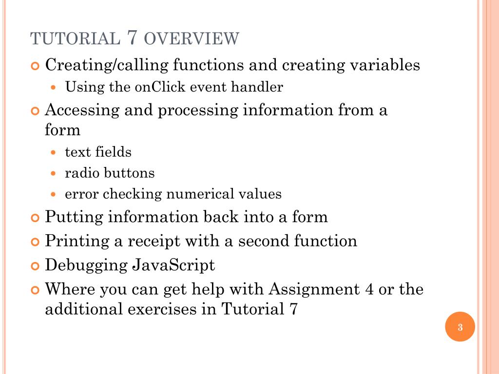 tutorial 7 overview • Creating/calling functions and creating variables • Using the onClick event handler • Accessing and processing information from a form • text fields • radio buttons • error checking numerical values • Putting information back into a form • Printing a receipt with a second function • Debugging JavaScript • Where you can get help with Assignment 4 or the additional exercises in Tutorial 7