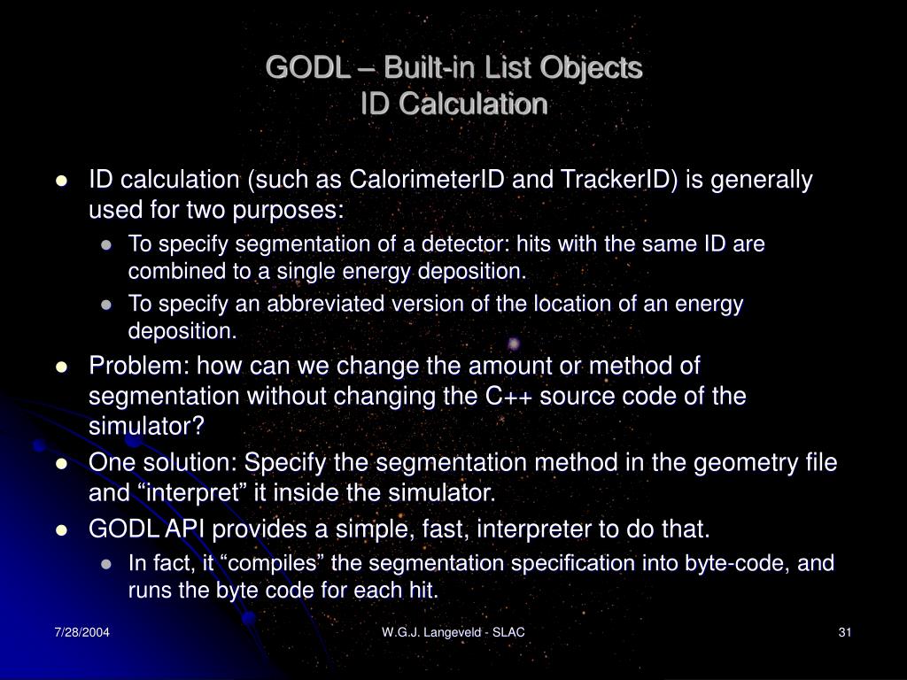 GODL – Built-in List ObjectsID Calculation • ID calculation (such as CalorimeterID and TrackerID) is generally used for two purposes: • To specify segmentation of a detector: hits with the same ID are combined to a single energy deposition. • To specify an abbreviated version of the location of an energy deposition. • Problem: how can we change the amount or method of segmentation without changing the C++ source code of the simulator? • One solution: Specify the segmentation method in the geometry file and “interpret” it inside the simulator. • GODL API provides a simple, fast, interpreter to do that. • In fact, it “compiles” the segmentation specification into byte-code, and runs the byte code for each hit. W.G.J. Langeveld - SLAC