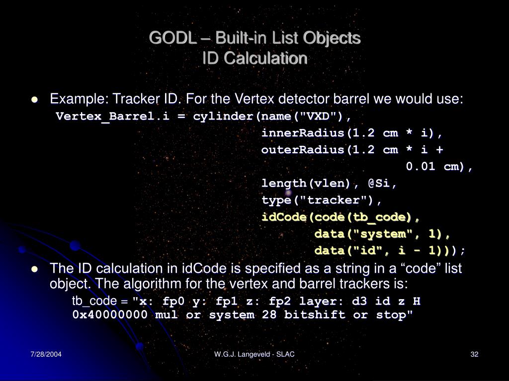 GODL – Built-in List ObjectsID Calculation • Example: Tracker ID. For the Vertex detector barrel we would use: Vertex_Barrel.i = cylinder(name("VXD"), innerRadius(1.2 cm * i), outerRadius(1.2 cm * i + 0.01 cm), length(vlen), @Si, type("tracker"), idCode(code(tb_code), data("system", 1), data("id", i - 1))); • The ID calculation in idCode is specified as a string in a “code” list object. The algorithm for the vertex and barrel trackers is: tb_code = "x: fp0 y: fp1 z: fp2 layer: d3 id z H 0x40000000 mul or system 28 bitshift or stop" W.G.J. Langeveld - SLAC